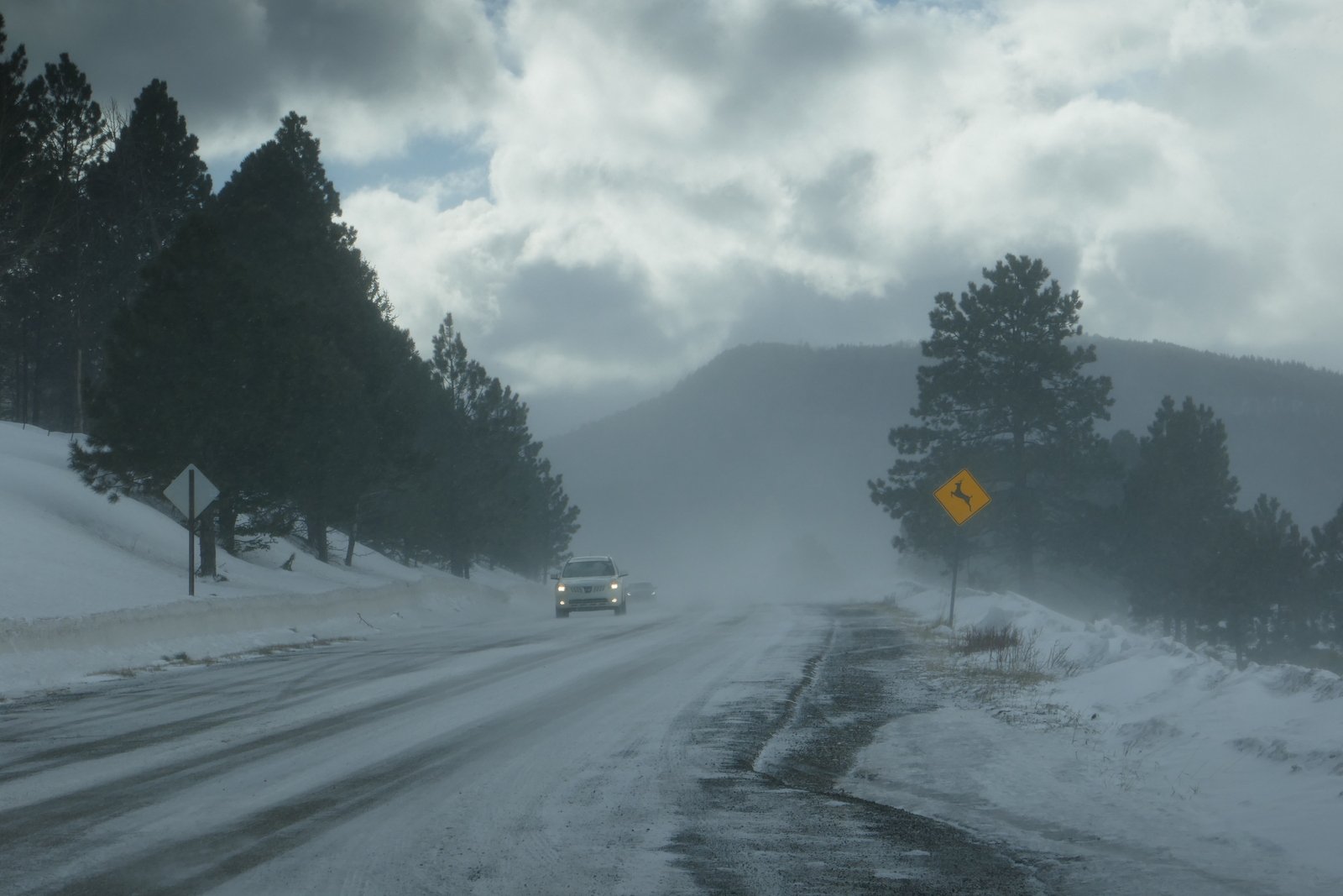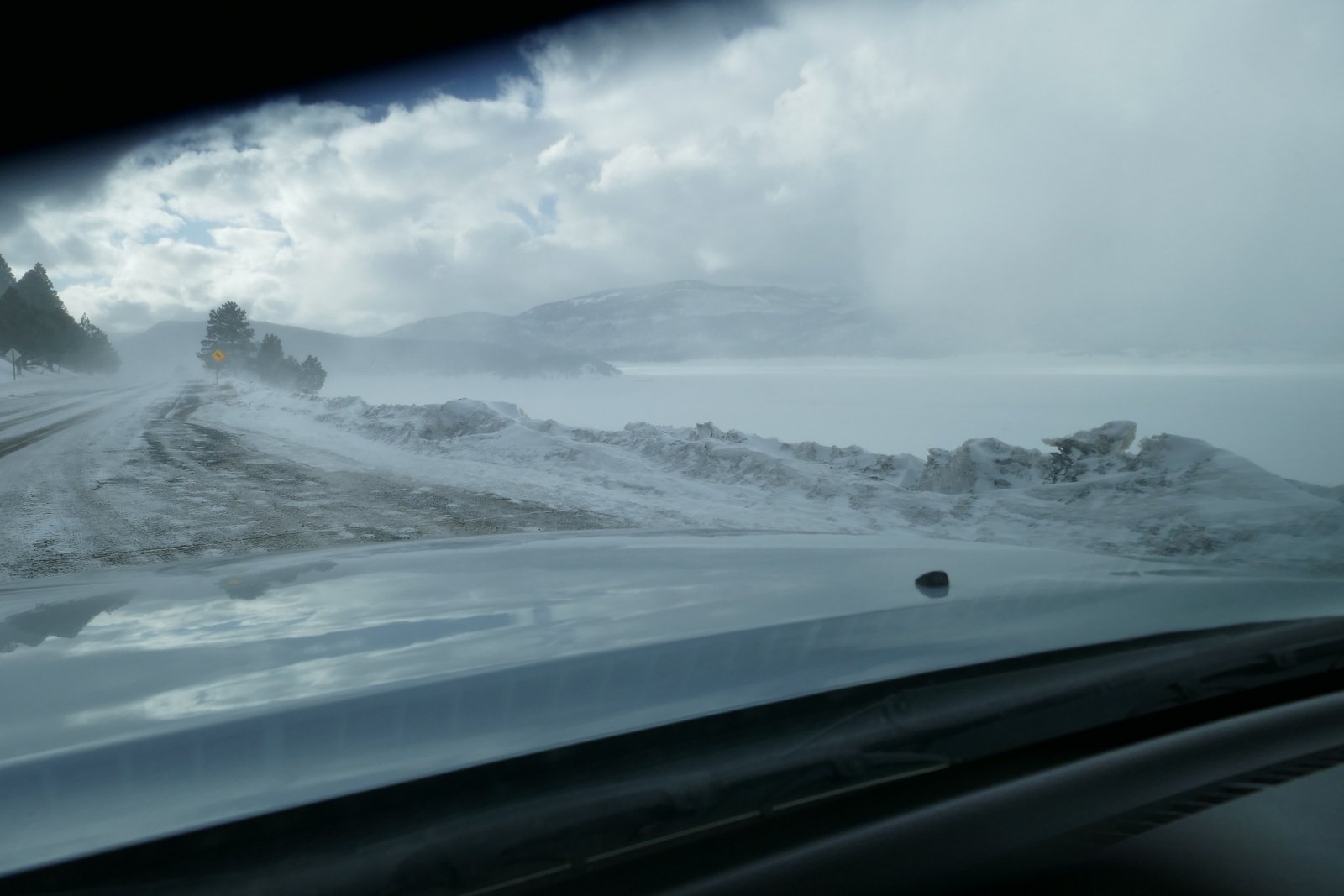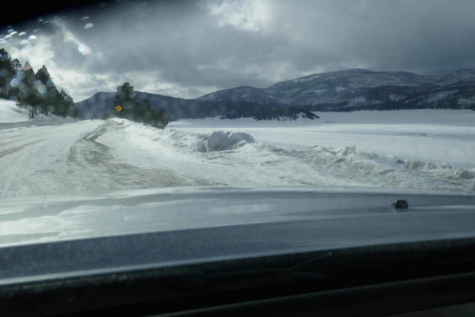 Still with a plan to make the loop on NM 4 (and have pizza in La Cueva), we continued on to Valles Caldera.  There we encountered — strong winds and numerous snow squalls passing through.  At one point in a squall, we could see only a few feet in front of the Tacoma, and otherwise we could not see across the valley.  Shortly the squalls passed, and between them we had amazing views across the valley, areas in full sun broken up by areas shaded by clouds.