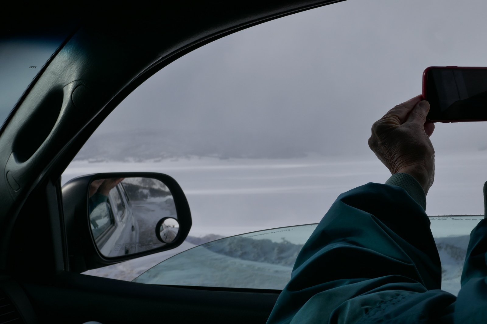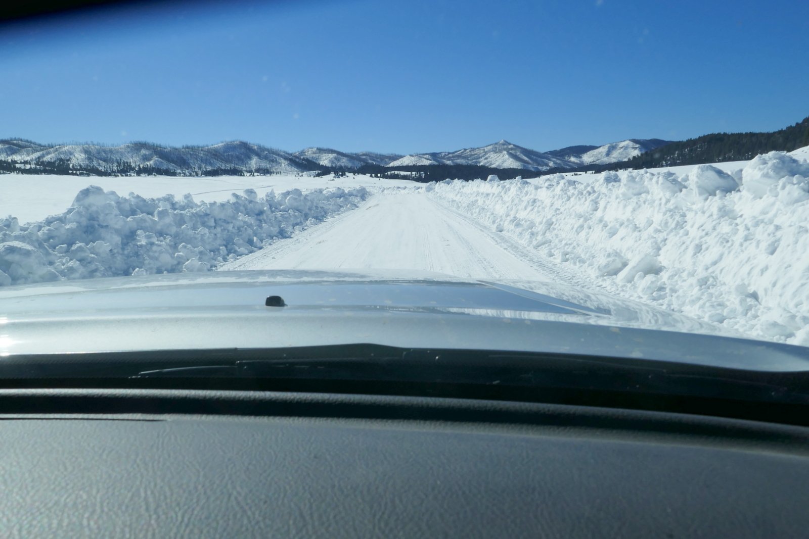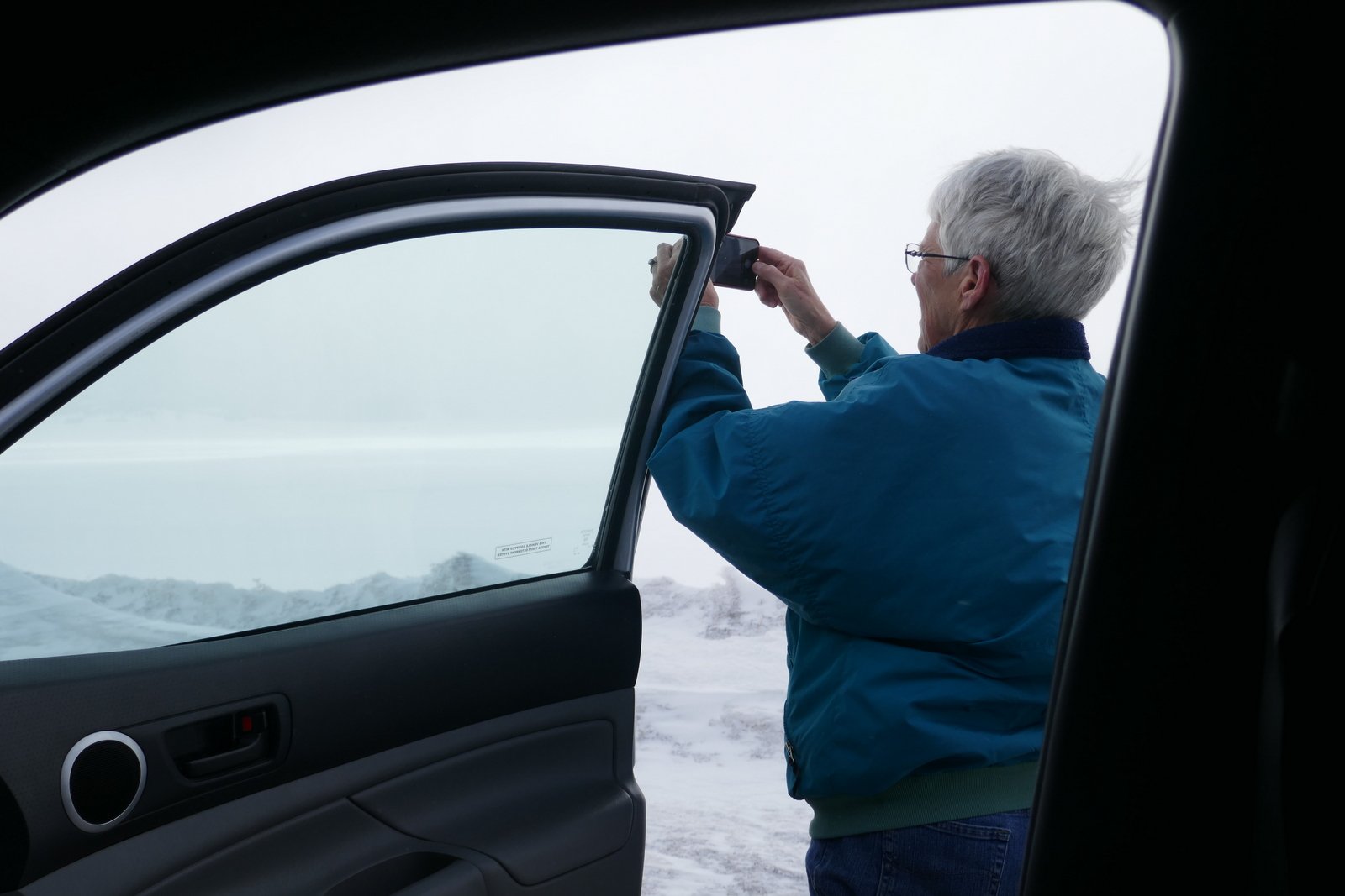 Still with a plan to make the loop on NM 4 (and have pizza in La Cueva), we continued on to Valles Caldera.  There we encountered — strong winds and numerous snow squalls passing through.  At one point in a squall, we could see only a few feet in front of the Tacoma, and otherwise we could not see across the valley.  Shortly the squalls passed, and between them we had amazing views across the valley, areas in full sun broken up by areas shaded by clouds.