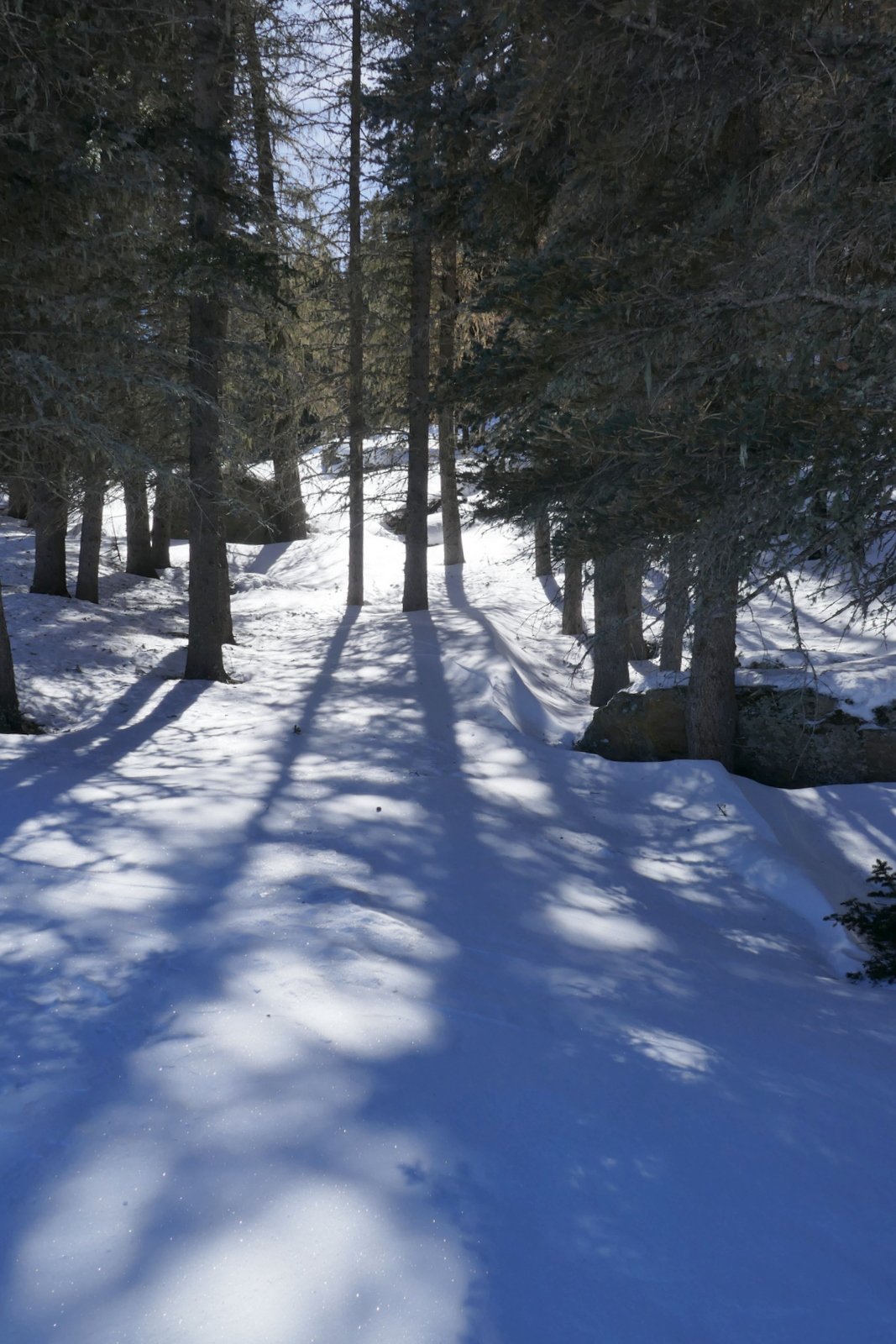 We opted to circumscribe La Jara.  Leaving the parking lot, we didn’t find -a- trail, but rather found tracks of others, using snowshoes or cross country skis, that headed out across the snow field. So we too went “cross country”, rounding the southeast slope of La Jara, heading across the open space to the edge of the forest on the northeast slop of South Mountain, then finishing our route around La Jara.