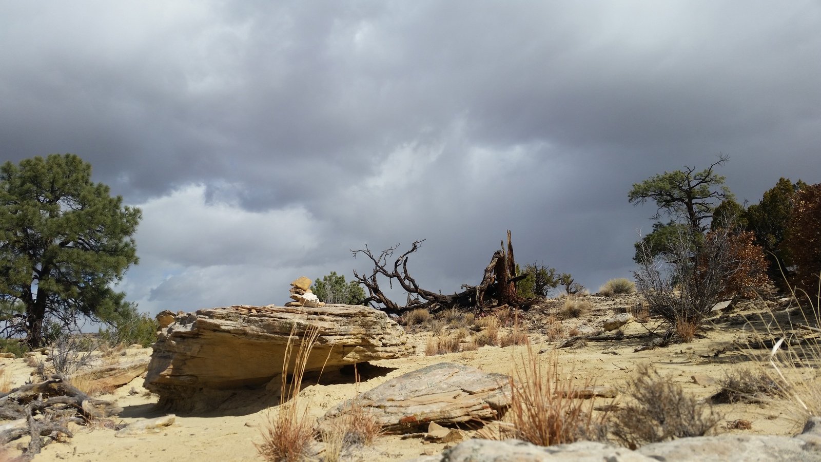 About 1.2 miles into the hike we rounded the point and headed south. Soon we began to see things that looked familiar. Sure enough, we realized that we had come to Hoodoo Pines, a destination for other hikes (Hoodoo Pines Hike – 01/03/2017 and Hoodoo Pines Hike – 12/17/2017). We also noticed that weather that had been bringing snow to the Naciemento Mountains to the northwest was spreading in our direction. It was time for our mid-hike break (fresh coffee and snacks). As the clouds to the west became darker, we beat a retreat to the truck. If any precipitation that fell on the 1 mile of two-track back to Pipeline Road, we would surely get stuck. It was a close call; we had snow flurries on our drive out.