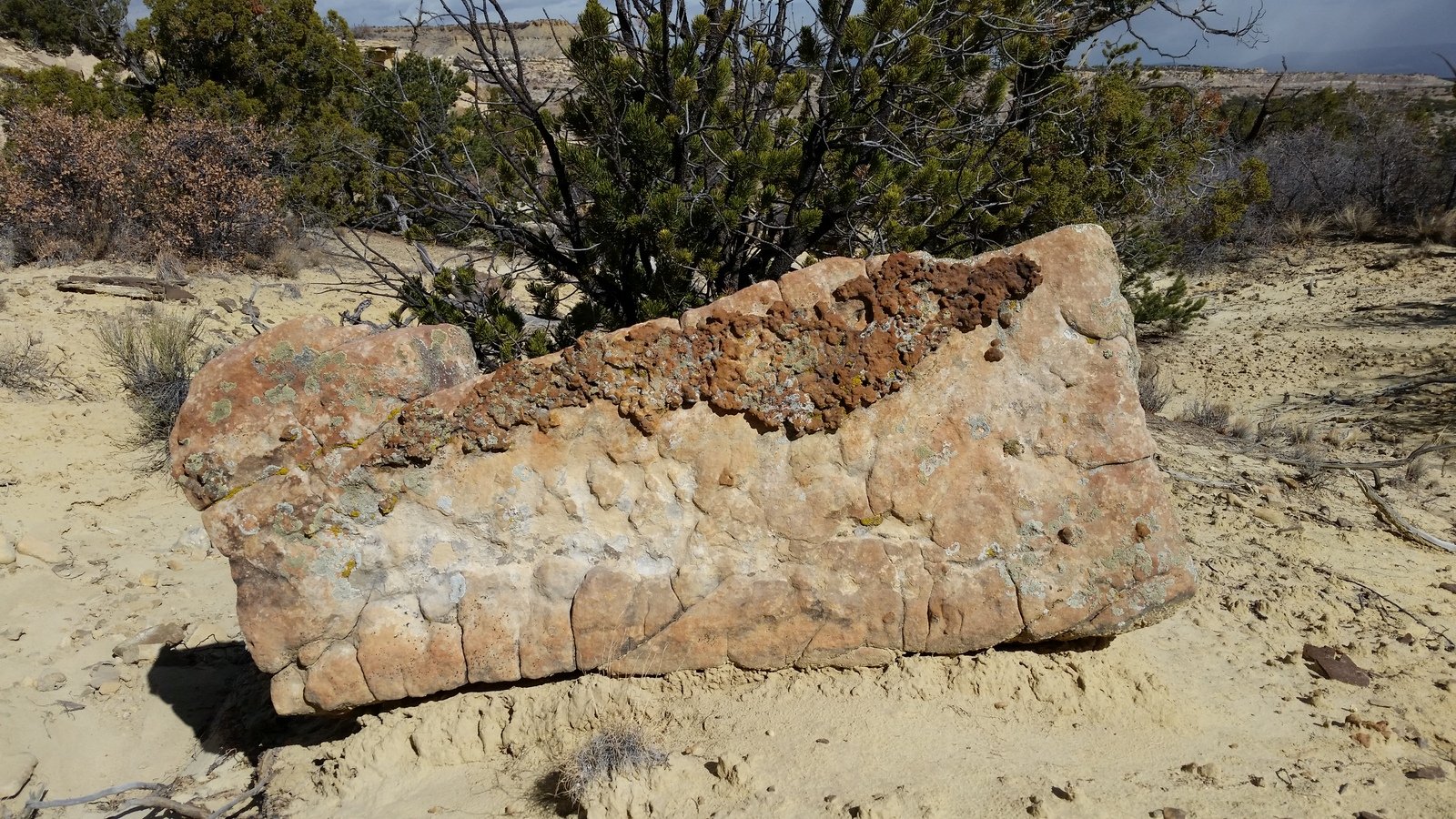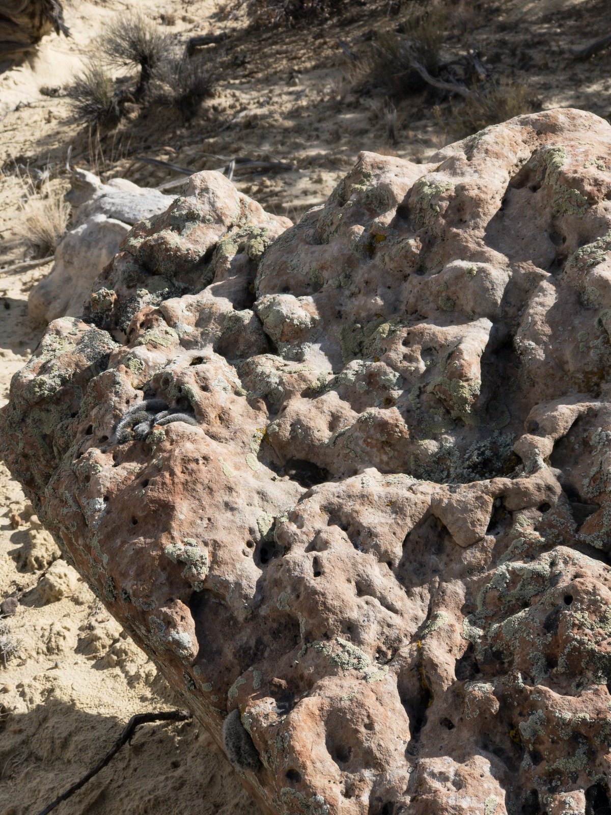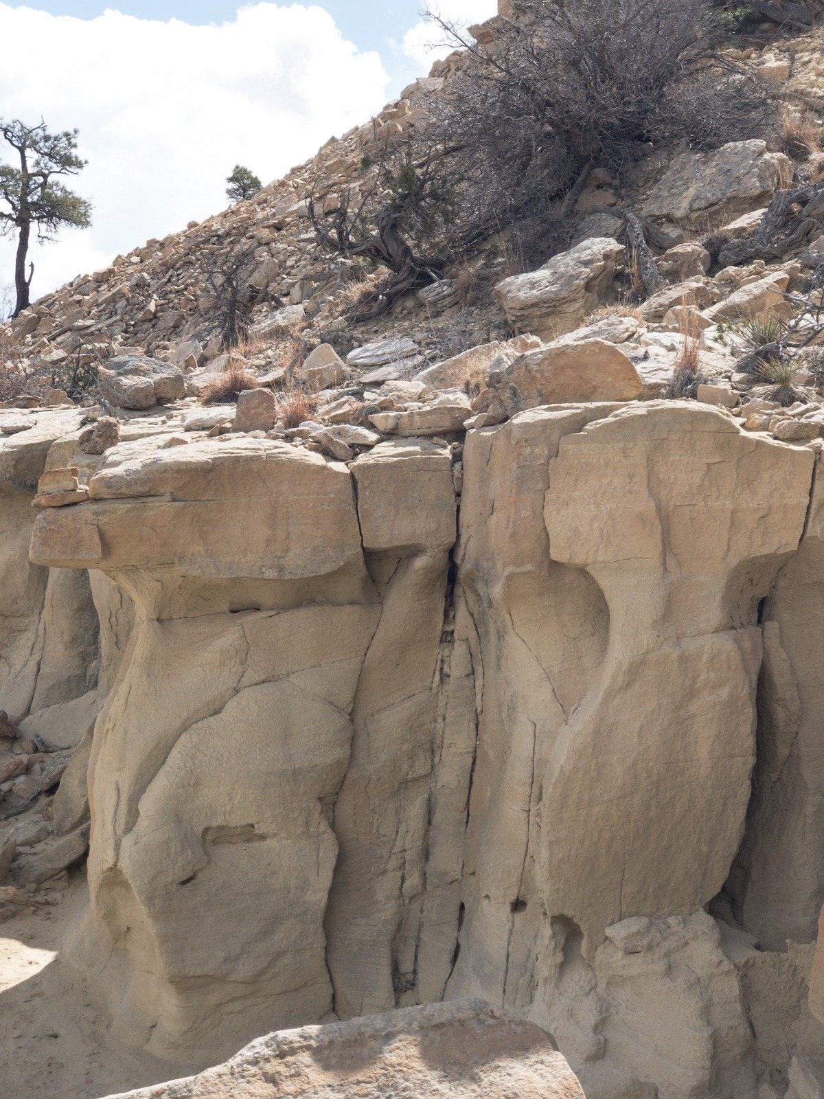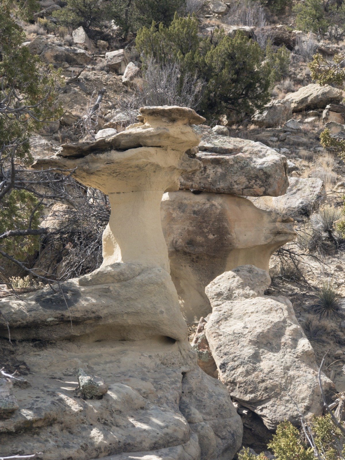 Always looking over us was the face of Bernalillito Mesa, with varying, interesting formations along the edge. We remembered that we had hiked out to the point of the Mesa (Bernalillito Mesa Top Hike – 12/11/2016) , and the deep crevices at the edge that defined large blocks that seemed to be ready to break off like calving icebergs (someday). Along the trail we found many quite interesting rock formations (check the photos below).
